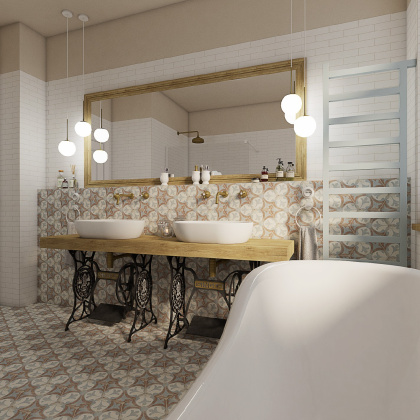 Netradiční prvky najdeme na každém kroku, ať už v podobě obráceného vědra jako posezení u kosmetického stolku, nebo radiátoru, který dává sousloví „koupelnový žebřík“ skutečný význam.